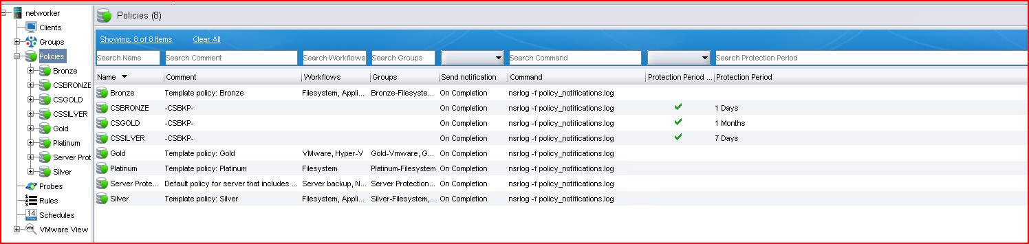 In the DELL EMC Networker Management Console create the desired POLICIES including the -CSBKP- tag in the comment section.